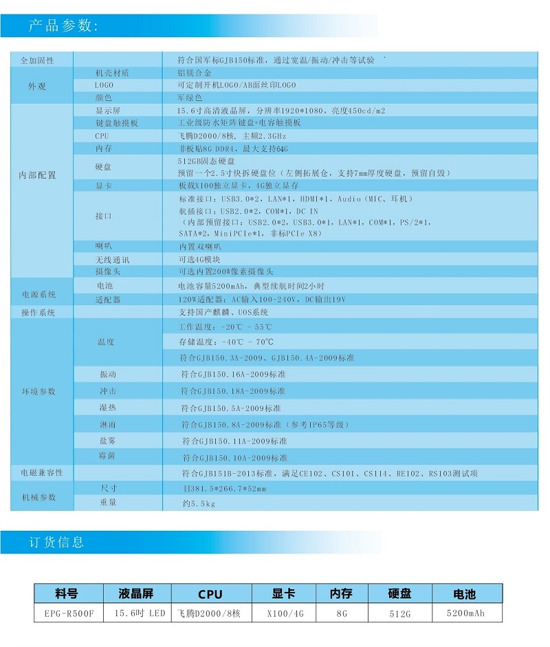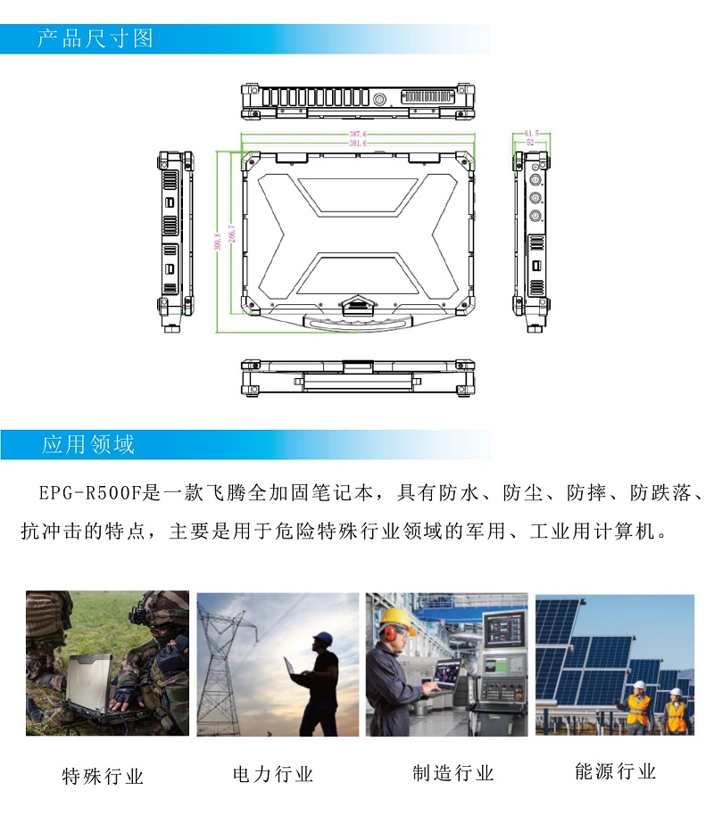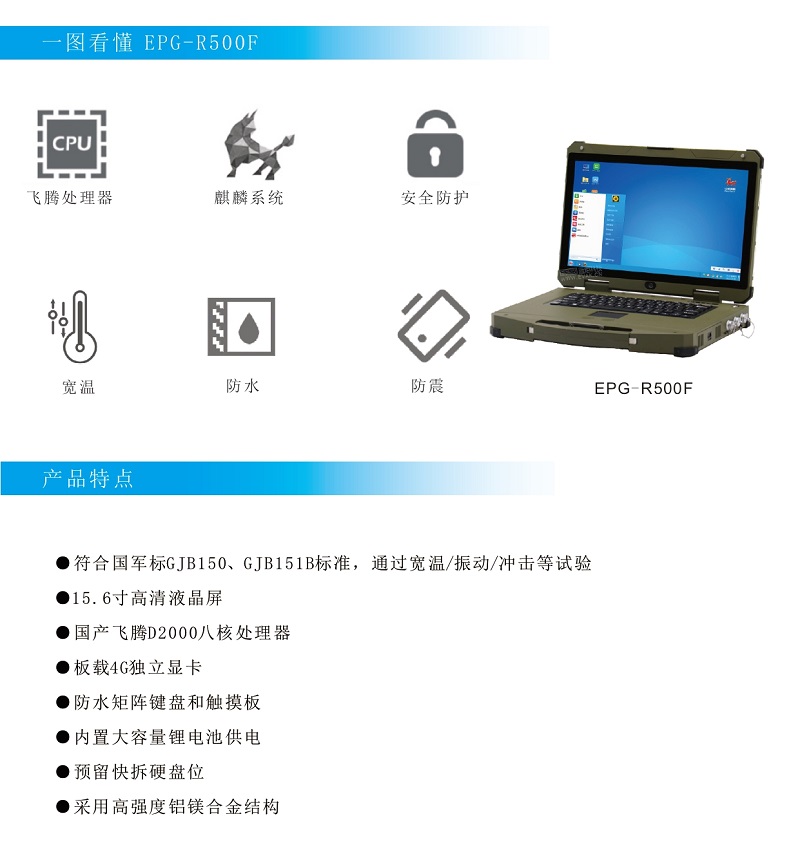 APQ-R500F是一款飞腾全加固笔记本,具有防水、防尘、防摔、防跌落、抗冲击的特点,主要是用于危险特殊行业领域的军用、工业用计算机。