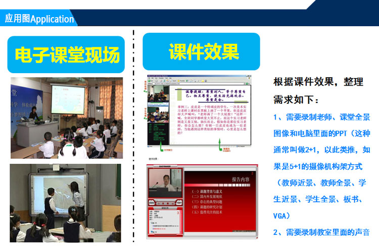 • 课堂直播系统.•通过IP网络,例如局域网,互联网,卫星网,将课堂内容直播出去,课堂内容包括音频、视频、计算机屏幕内容、电子白板等。观看端通过IE浏览器即可观看整个课堂内容。