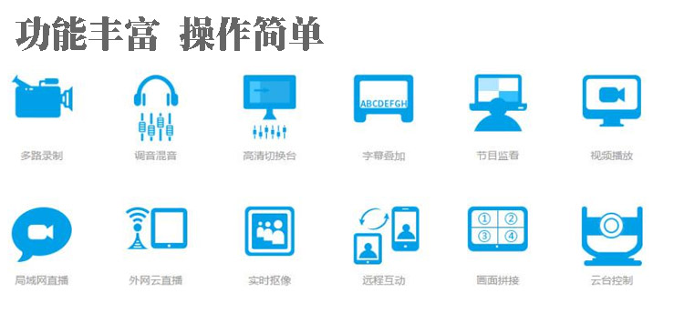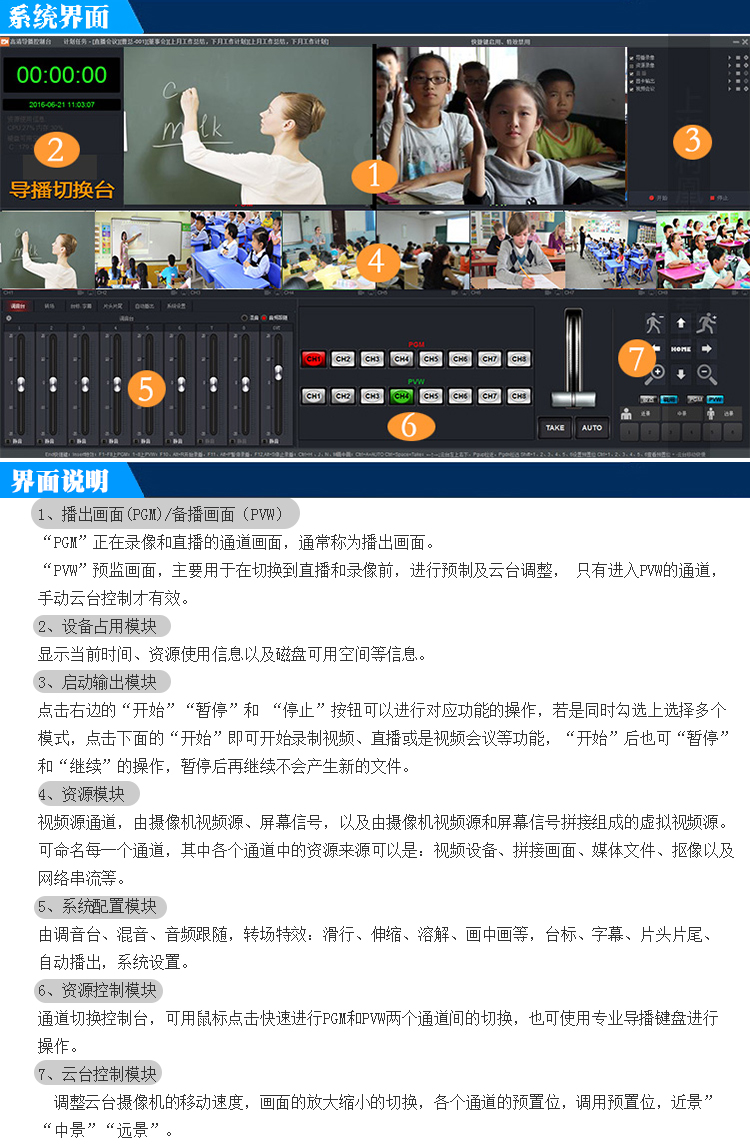 •智能导播系统集传统自动录播系统导播功能和特效切换台于一体,主要用于课程录制过程中多个场景及多路视频信号源、文件、计算机画面之间的自动切换,系统随教学活动的变化智能选择切换策略,并实时带特效功能的导播系统。